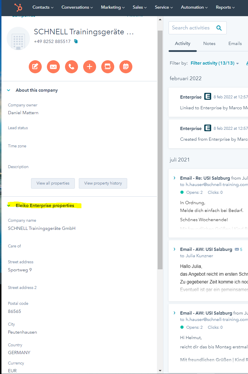 After the company is created close the window and go back to HubSpot. The company is now linked and the information is updated with the same information as Enterprise. If you update any of the Eleiko Enterprise Properties in HubSpot it will also be updated in Enterprise. (And also the other way around if someone would update the customer in Enterprise it will also be updated in HubSpot.)