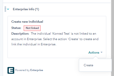 Now you can close the Enterprise pop-up window and go back to HubSpot where you, under Enterprise info in the right hand column, can see that the Contact now is linked to a Private person (Type: Customer) in Enterprise.