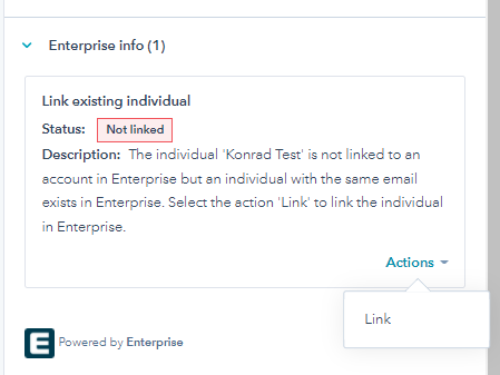 Click Link and wait. The page will be reloaded and and now you have a link between this contact in HubSpot and Enterprise.