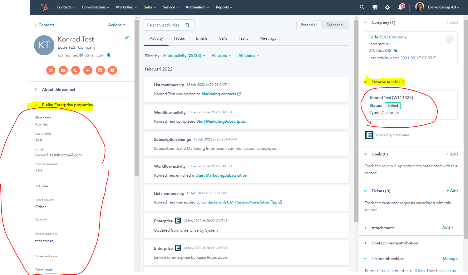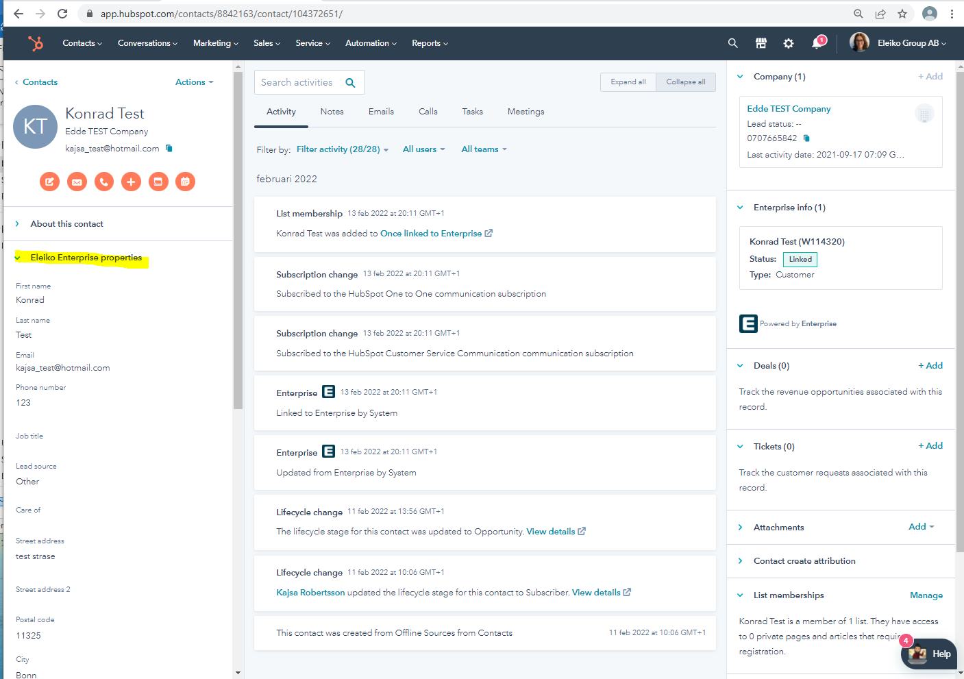 Note that Enterprise is "master" when the link is made and the data from Enterprise will now be saved to this contact in HubSpot for the Eleiko Enterprise Properties