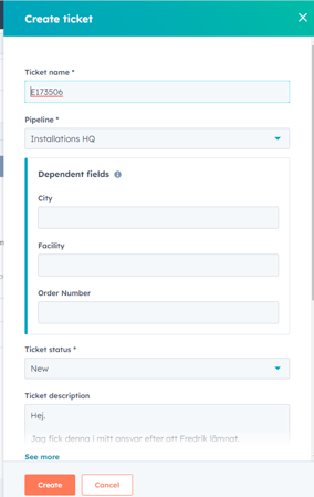 No need to add any information to the ticket as it is going to be merged into the already existing ticket. Just name the ticket the customer name or the order number if an order is connected to the ticket (ie installations).