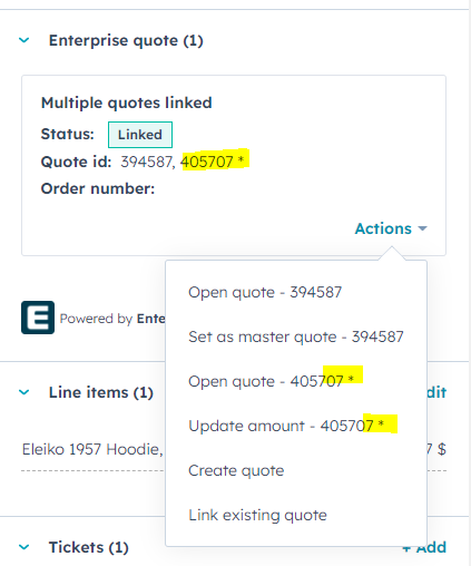 This last created/linked Quote will now be set as master quote. This is indicated with a * next to the Quote number