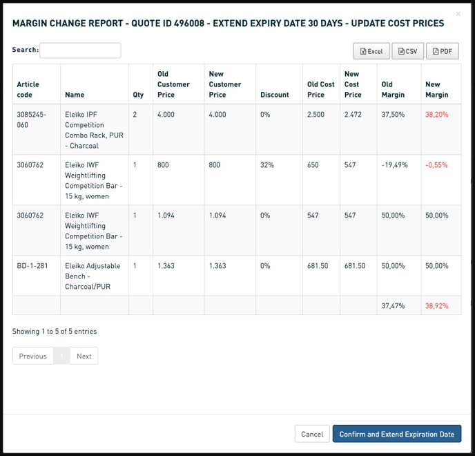 Should you require an extension of the expiration date while maintaining the margin, you may do so by selecting this function. It is important to note that this option should be rarely used and only, when necessary, as it results in saving the cost price for the specified period. As a result, the process is subject to the approval of your manager. Note: This is the cost price based on order book / quote. When it comes to the delivery/invoicing the cost price on that day will affect of course the margin. As a general rule, pricing should not exceed a validity period of 30 days*. You may opt for either option 2 or 3, which allows you to extend the offer with ease.